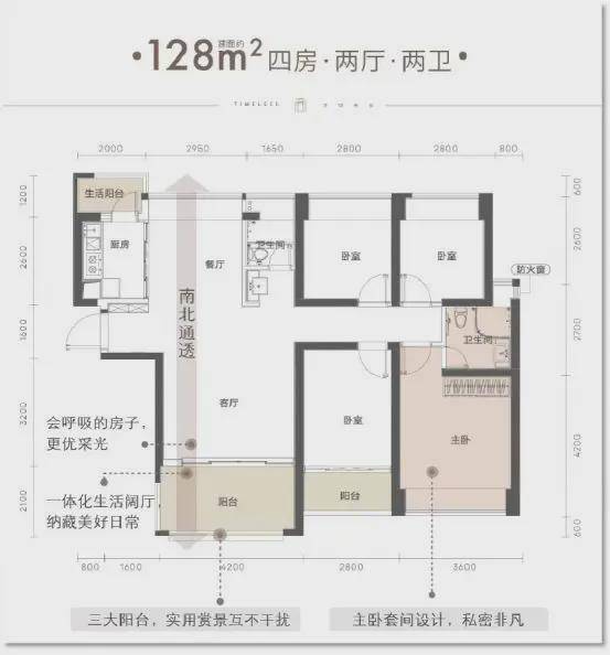 A/B座128-133㎡户型,四房两厅两卫,东南朝向