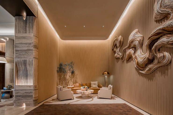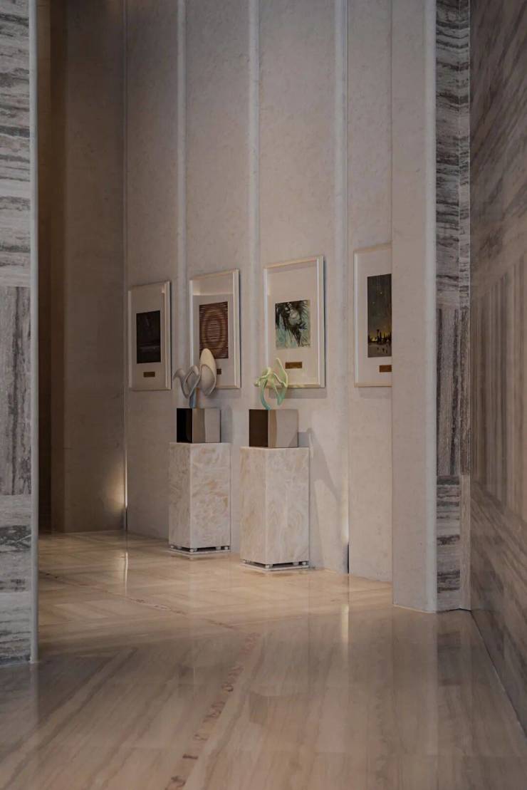 (艺术走廊两侧是竖向石材立柱,搭配线性灯光,将视线自然引向电梯入口)