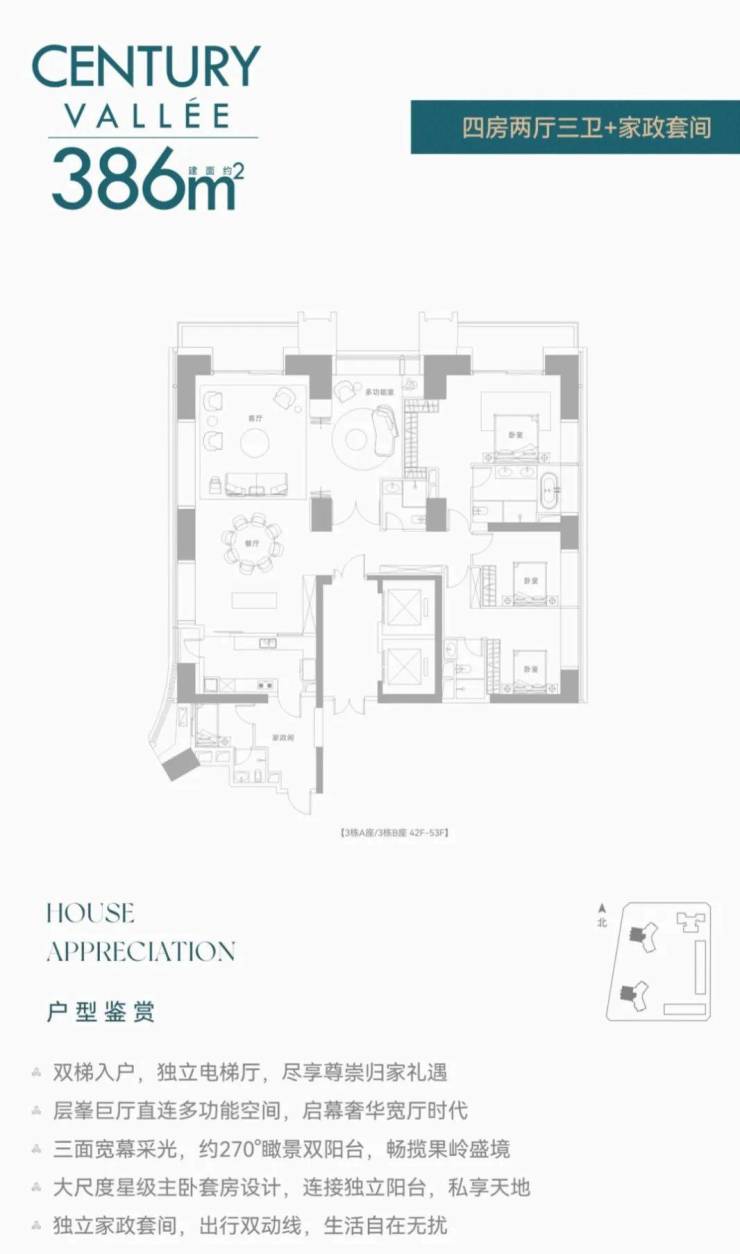【约386㎡4+1房4卫】双梯入户,独立电梯厅,阔绰横厅直连多功能空间,三面舒适采光,主次卧双套房,270°环幕视野,还有独立家政套间,西朝向看名商高尔夫和大河沙生态长廊。