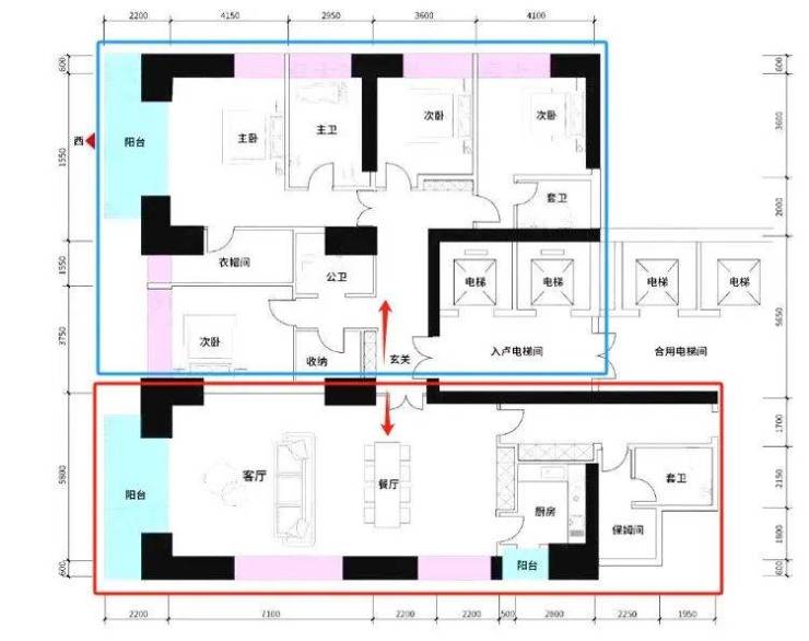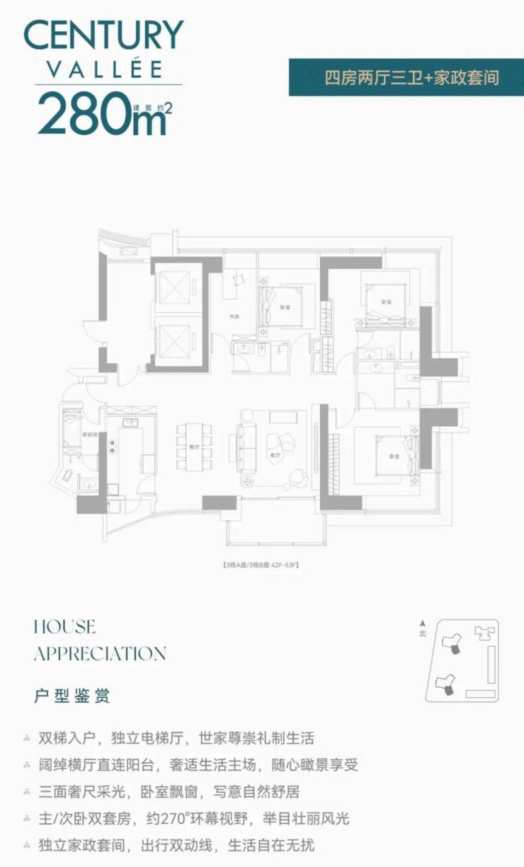 【约233㎡3+1房3卫】双梯入户,独立电梯厅,餐客大横厅贯通阳台,三面采光,主次卧尽享270°环幕视野,还有独立家政套间,西北朝向看名商和沙河高尔夫;
