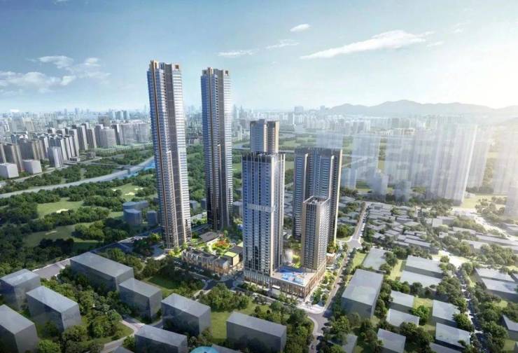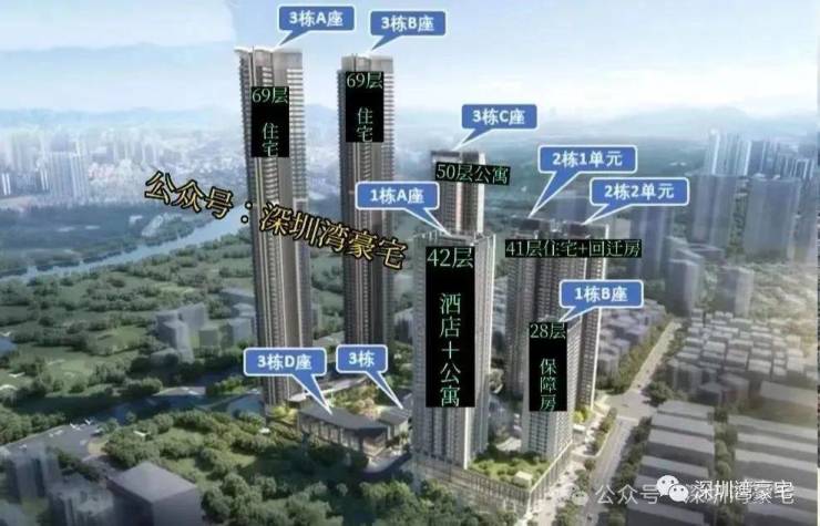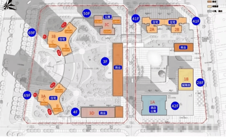 整个项目分两期开发建设,其中:项目一期东地块包含1栋酒店+商务公寓、1栋保障房、2栋包含一、二单元的住宅;西地块包含2栋高约250米的超高层住宅,另有1栋约50层高的商务公寓。