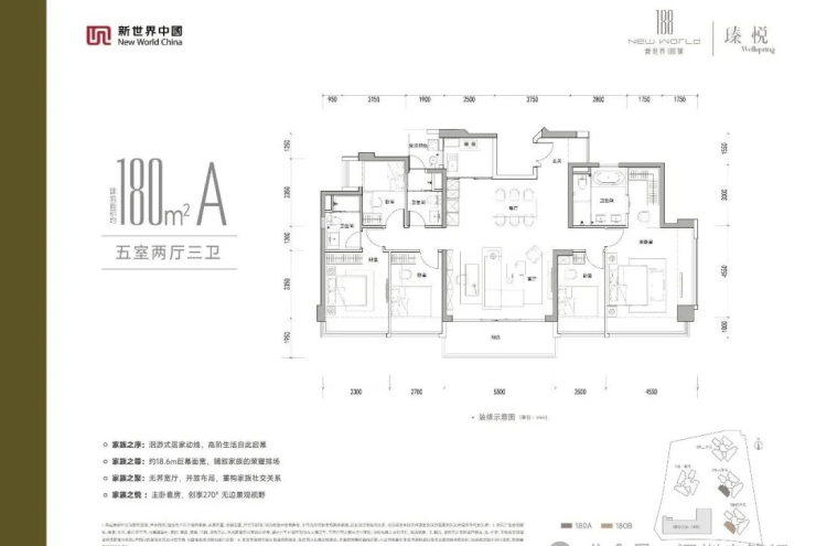 180㎡五房三卫:这是楼王户型,竖厅双龙抱珠格局,客厅5.5米开间,LDKB一体化设计,五开间朝南,约18.6米巨幕面宽。双主卧套间设计,主卧达到30.5㎡,非常奢适。U型厨房,公卫带生活阳台约3.89㎡,阳台约10.73㎡。西南朝向,少量稀缺房源。