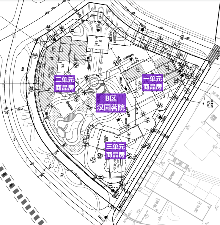 B区由3栋三个单元、裙房组成,其中一二单元层数45层,三单元层数39层,总户数474套;
