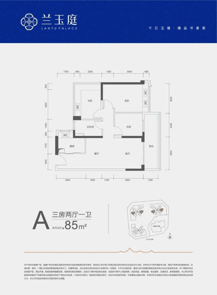 85㎡的3房2厅1卫,A户型,设计的是竖厅格局,客厅开间3.3米,LDKB一体化,三开间朝南,3个卧室分别做到了3米/2.8米/2.4米的宽度,客厅连接次卧出5.7米长的大阳台,L型厨房,得房率约79%(不含赠送),西南或东南经向。