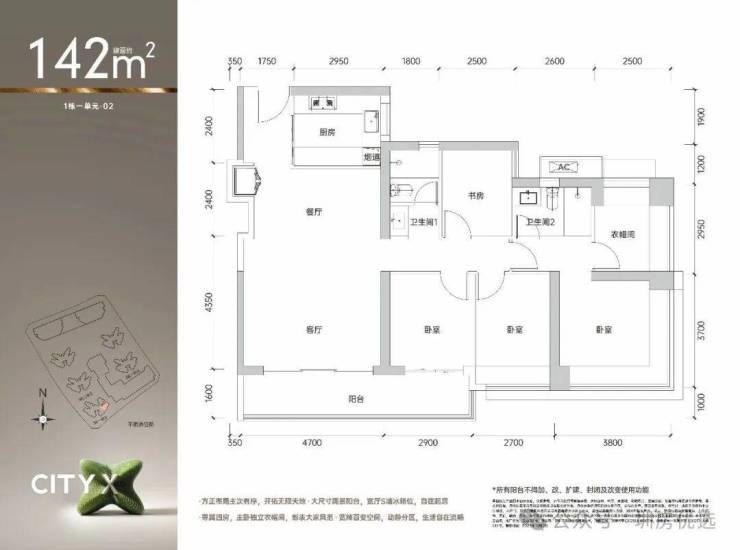 142㎡的4房2厅2卫得房率约75.4%(不含赠送),客厅连接次卧出12.16㎡的观景大阳台,东南朝向。套内面积107.06㎡+赠送面积14.75㎡=实得121.81㎡,加上赠送后得房率约85.78%。