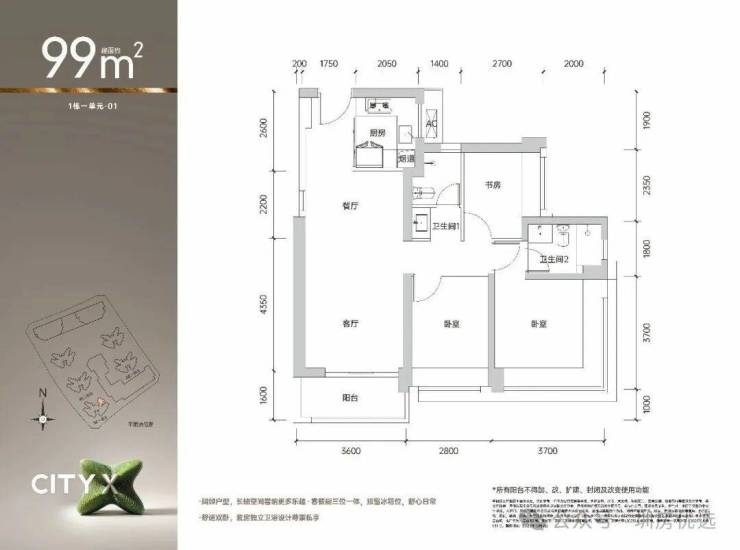 98㎡的3房2厅2卫得房率约75.4%(不含赠送),东北朝向。套内面积73.89㎡+赠送面积10.05㎡=实得83.94㎡,加上赠送后得房率约85.65%。