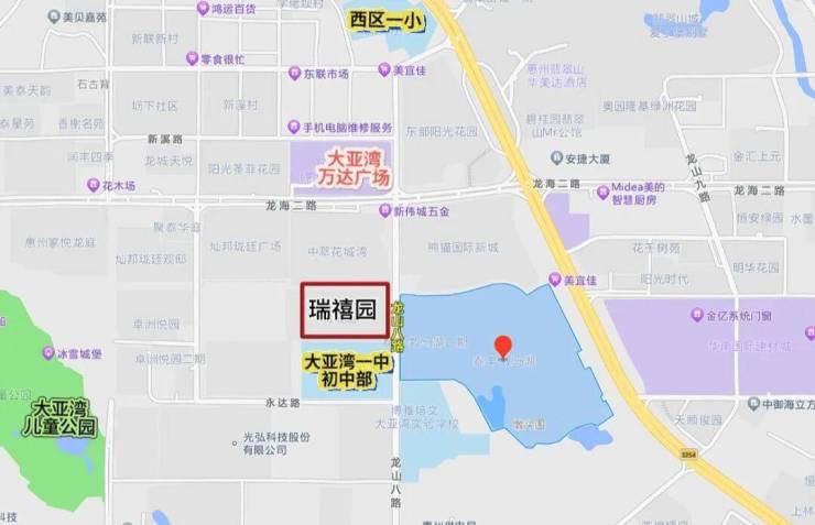 瑞禧园位于大亚湾西区龙山八路上,靠近龙海二路主干道,距离深圳坪山地界约7公里,地处惠州大亚湾繁华的万达商圈,周边众多楼盘已经建成入住,生活氛围浓厚,同时周边规划有多所学校及多个商业体,另外还有写字楼、银行、公园等多方面配套,是片区居住氛围浓厚板块。