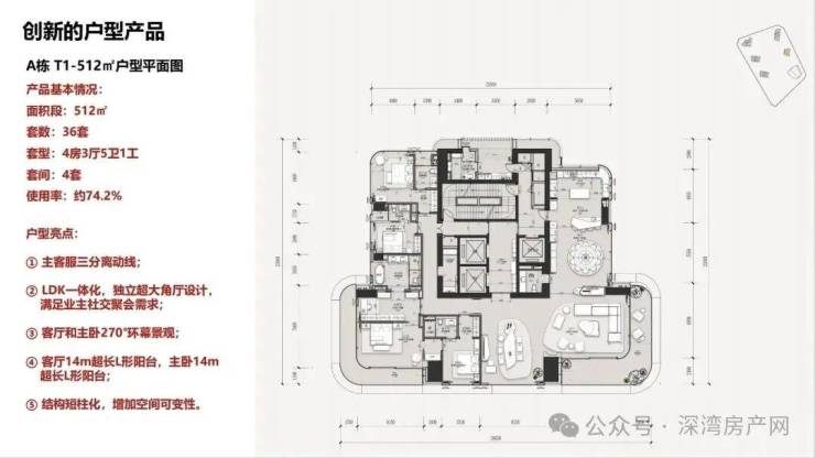 约 305㎡的户型则为 4 + 1 房 2 厅 4 卫 ,空间更加宽敞奢阔 。客厅采用横厅设计,视野开阔,与餐厅、阳台相连,形成一个一体化的社交空间 。在这里,你可以举办家庭聚会,邀请亲朋好友共度美好时光;也可以独自享受宁静的午后时光,阅读、品茶,享受惬意的生活 。主卧套房设计,配备独立的卫生间、衣帽间和阳台,为主人提供了私密、舒适的居住空间 。