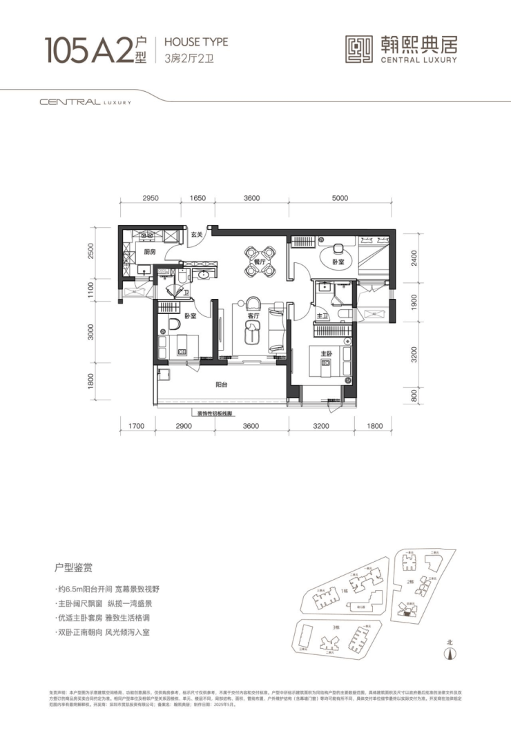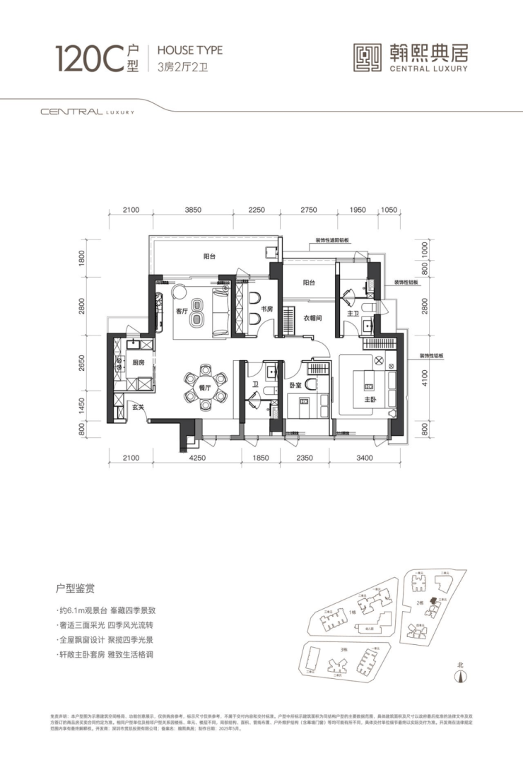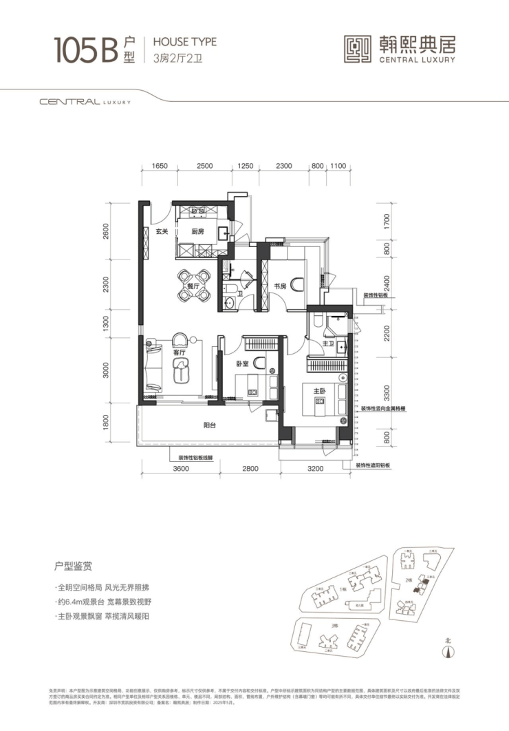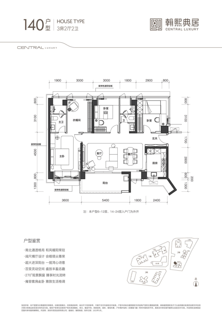 该户型为 02 地块的唯一一条腿,非常稀缺。户型南北通透,带大主卧套房的奢居型三房。带 5.4m 观景台,大横厅奢阔空间设计,主卧同客厅阳台、餐厅三面宽朝西南。北向双次卧、双卫生间、拓展空间共五面宽一字排开,视野全面俯瞰社区内园林,静谧舒适。