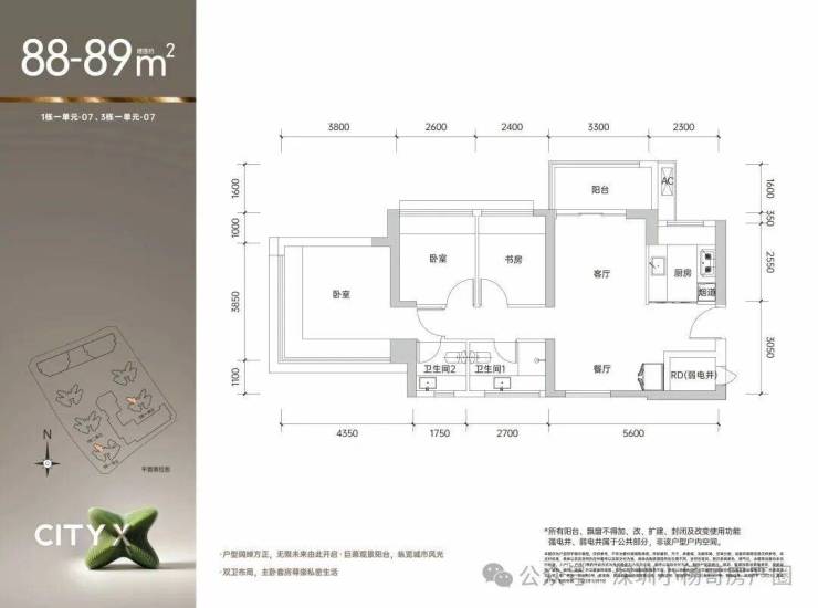 89㎡的3房2厅2卫,3栋1单元01/07户型,设计的是竖厅南北通透格局,客厅3.3米开间,LDKB一体化设计,四开间朝南,主卧270°无转角飘窗,3个卧室分别做到了主卧15.63㎡/次卧7.54㎡/次卧6.96㎡(包含墙体飘窗),U型厨房,卫生间干湿分离,得房率约90%(包含赠送),阳台主朝西北或东北向。