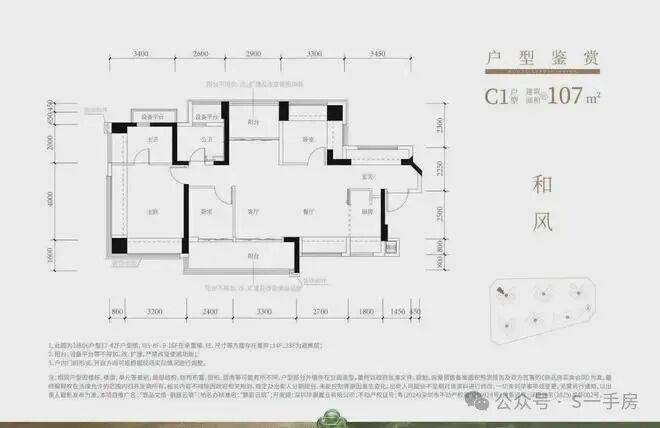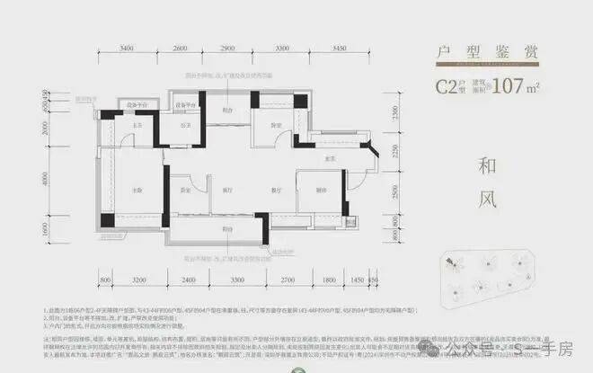 107㎡的4房2厅2卫,设计的是横厅南北通透格局,进门赠送约4㎡入户玄关,客餐厅5.9米开间,4个卧室分别做到了主卧17.9㎡/次卧9.48㎡/次卧8.47㎡/次卧6.06㎡(实测面积,去掉墙体),主卧+1个次卧270°飘窗,客厅连接次卧出5.7米长大阳台,U型厨房,得房率约102.5%(包含赠送),阳台主朝西南向。