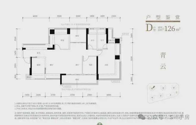 126㎡的4房2厅2卫,设计的是横厅南北通透格局,进门赠送约4.2㎡的入户玄关,客餐厅6.35米开间,4个卧室分别做到了主卧21.37㎡/次卧10.22㎡/次卧10.19㎡/次卧7.39㎡(实测面积,去掉墙体),主卧+1个次卧270°飘窗,客厅连接次卧出6.3米长大阳台,L型厨房,得房率约103.5%(包含赠送),阳台主朝东南向。