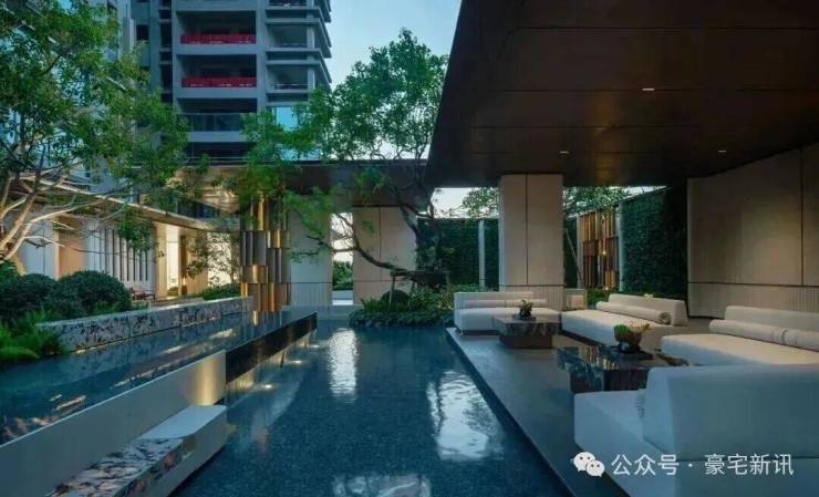 园林设计上,森系度假美学景观,公区质感跃级,优选石材、铝板、铝格栅等,入户大堂奢华感拉满。
