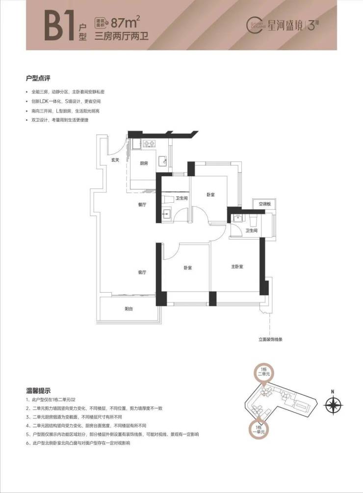 87㎡的3房2厅2卫(1栋2单元01/02户型),设计的是竖厅格局,创新LDK一体化餐客厅,S墙设计预留冰箱位,三开间朝南,次卧270度环幕设计,U型厨房,卫生间干湿分离,得房率76%(不含赠送),全部西南朝向。
