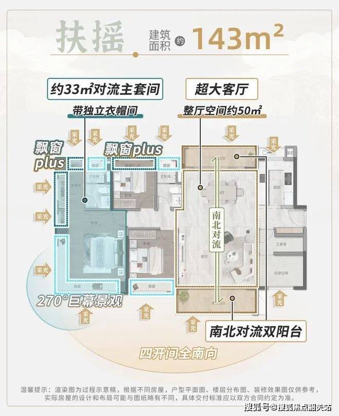 143㎡南北对流四房,是125㎡的放大版,每个空间都更加阔绰些,而且主卧还有一个步入式的衣帽间。