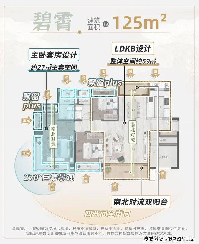 125㎡南北对流四房户型,双阳台设计,餐客厅开间比同面积段都要宽,主卧也是能做到南北对流。