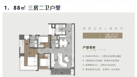 88㎡三房二卫:户型方正实用,满足刚需家庭需求。