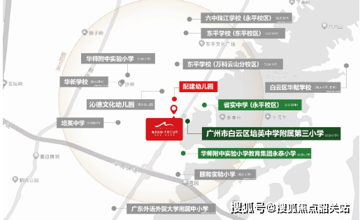 项目配建了一所9班幼儿园,并且对口的小学已经正式更名为广州市白云区培英中学附属第三小学,该小学隶属于广州老牌名校培英中学教育集团,教学质量可靠。此外,项目北侧规划有一处中小学用地,周边3公里内还有多所知名学校,形成了一个优质的教育圈层。
