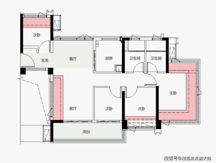 动静分区:动线集中于户型一侧,静区(卧室)远离电梯厅。