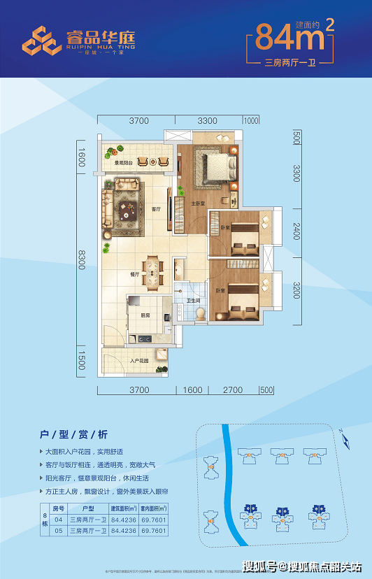 建面约 84㎡的户型为三房两厅一卫设计,是专为年轻置业群体打造的高性价比上车户型,空间利用率极高,无任何浪费面积。户型采用三开间朝南设计,客厅与两个卧室均朝南向,保障了充足的采光时长,客餐一体化设计,客厅连接南向景观阳台,拓展了公共活动空间,同时可享受社区园林景观。户型设置独立入户花园,可打造入户收纳系统,提升空间整洁度,三个卧室均预留充足的衣柜空间,可满足一家三口的居住需求,功能齐全,布局紧凑,是刚需置业的优选户型。