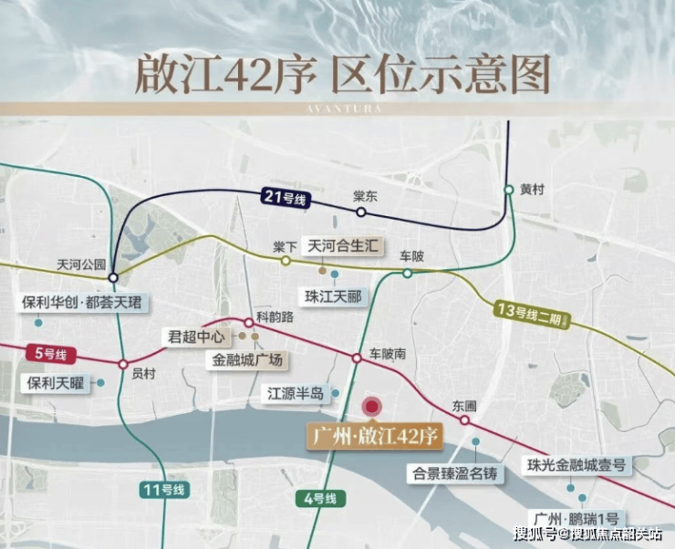 项目位于广州市天河区广州国际金融城东区,临江大道与科韵路交汇处以东约500米处。行政上属于天河区,是国际金融城规划范围内极为稀缺的一线临江住宅地块。