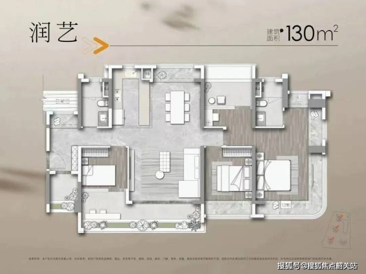 天河润府项目中建面约130㎡的户型在设计上几乎完全被飘窗和阳台所包围,这为户型提供了绝佳的光照条件。这个户型的特点是南向、北向和东向几乎都能够实现全面采光。