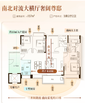 建面约137㎡四房:南北通透,约10㎡入户花园,7米大横厅搭配景观阳台,主卧套房配置独立卫浴与衣帽间,堪称板块性价比之王。
