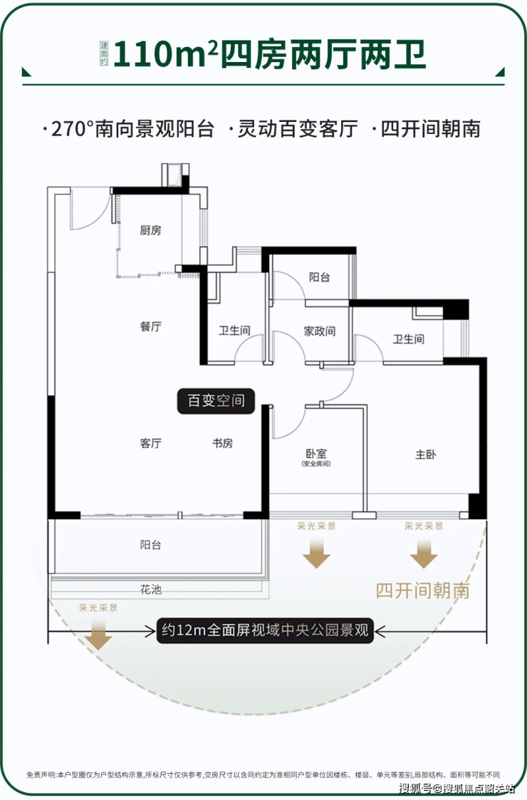 在售户型以改善型四房为主,面积段覆盖刚需至改善需求,户型布局方正合理,空间利用率高,均采用南北通透设计,保障室内通风采光。其中主力户型为120-140㎡四房两厅两卫,客厅开间达4.5米,搭配超大观景阳台,连接客厅与次卧,拓展空间视野;主卧采用套间设计,配备独立卫生间与衣帽间,兼顾私密性与舒适度。