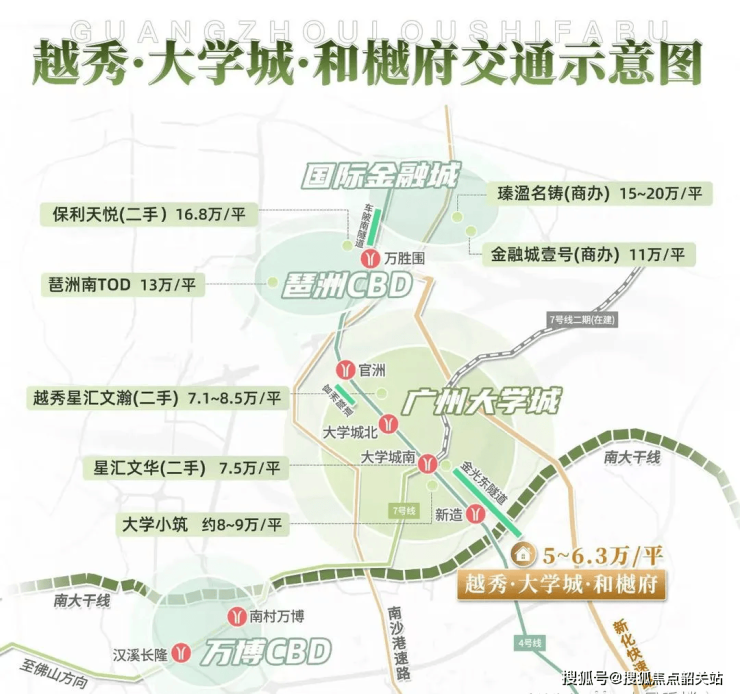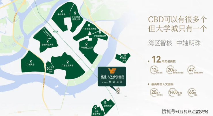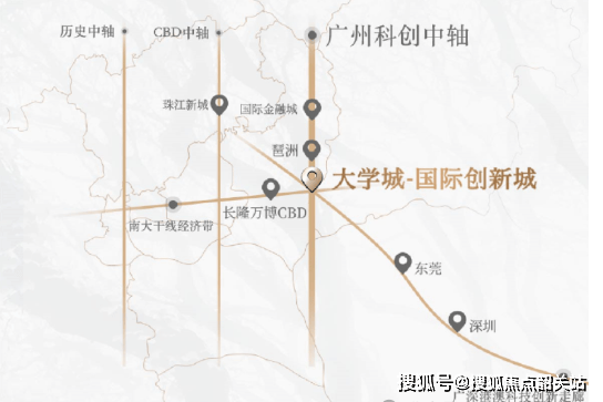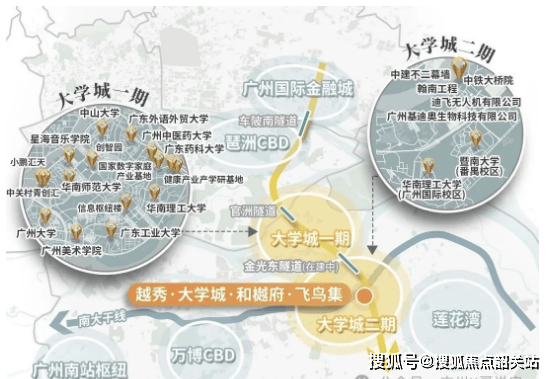 项目坐落于大学城二期-国际创新城核心板块,该板块又称大学城2.0版本,规划总面积达十平方公里,空间结构上形成“一核两翼”格局,核心为大学城,北翼为生物岛,南翼涵盖南岸起步区、南村、化龙及国际展贸城等区域,是广州重点发展的科创与人居融合板块。
