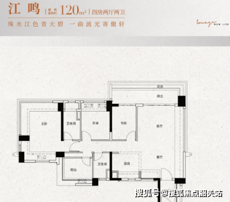 约120㎡四房两厅两卫:四开间朝南,配备大阳台或南北双阳台,主卧带270°飘窗。