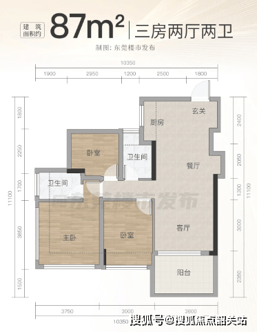 项目户型设计遵循新规标准,空间利用率实现突破,87-155㎡三至四房各具特色。约 87㎡三房两厅两卫采用 LDBK 一体化设计,功能区紧密相连,阳台开间 3.6 米、进深 2.35 米,面积约 8.46㎡,尺度优于同面积产品,且是东城首个 90㎡以下新规产品,为刚需群体提供优质选择。