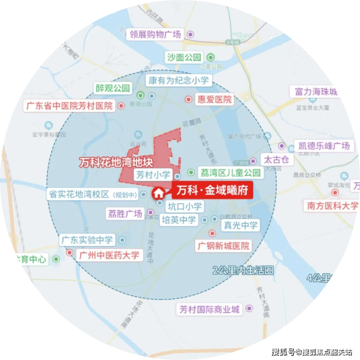 商业配套潜力巨大,太古里、意向进驻的万象城落子荔湾,重塑区域商业格局,项目周边现有乐峰广场、广百百货等,满足日常购物需求。教育资源密集,规划引进优质九年一贯制学校,省实花地湾校区(2023 年 9 月开学)一路之隔,真光中学、培英中学等百年名校环绕,芳村小学、培真小学近在咫尺,实现全龄段教育覆盖。