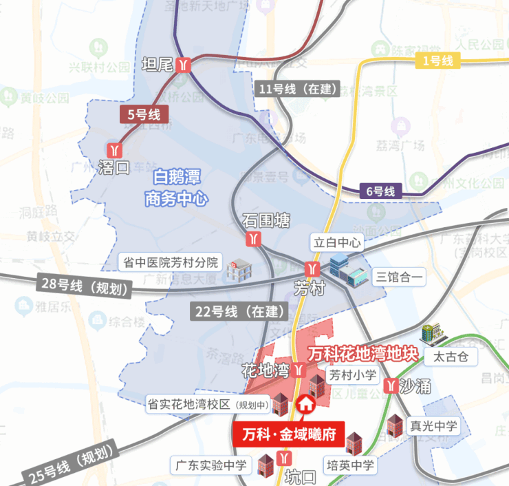 万科金域曦府坐落于荔湾芳村板块核心,紧邻花地湾,尽享老城区成熟配套与新规划红利。交通优势显著,距 1 号线花地湾、坑口站约 600 米,在建 22 号线、11 号线及规划 28 号线、25 号线环绕,未来四轨交汇,通勤高效;通过周边主干道,快速通达珠江新城、海珠等区域。