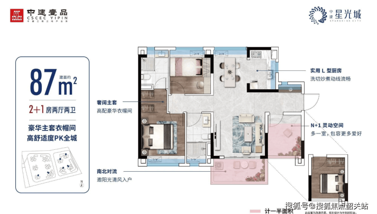 建面约87㎡ 南北通透主套大3房:三开间朝南,南北穿堂对流,餐客厅一体化设计。