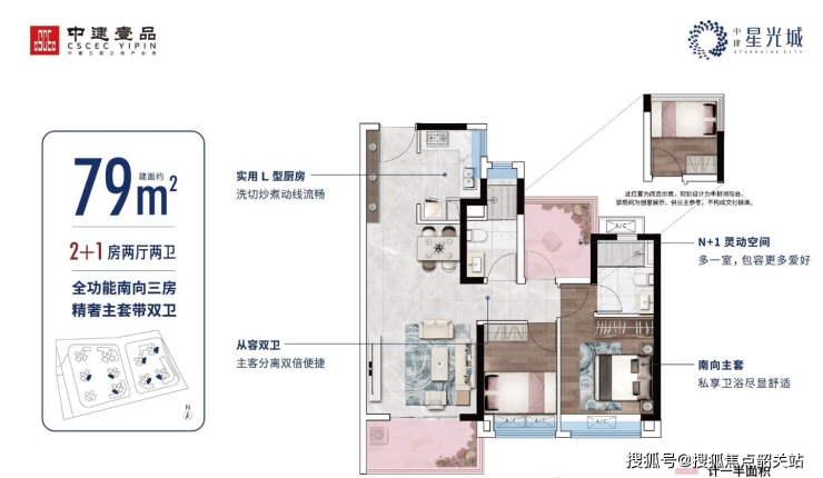 建面约79㎡ 主套双卫3房:东南向瞰园林,极致空间布局,功能划分更优。