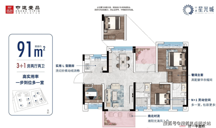 建面约91㎡ 南北通透4房:方正户型,南北通透,实用率高达96%。