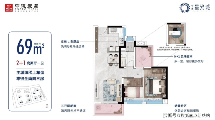 建面约69㎡ 南向三房:稀有纯南向设计,三开间朝南,阳台开间达3.2米,实用率高达94%。
