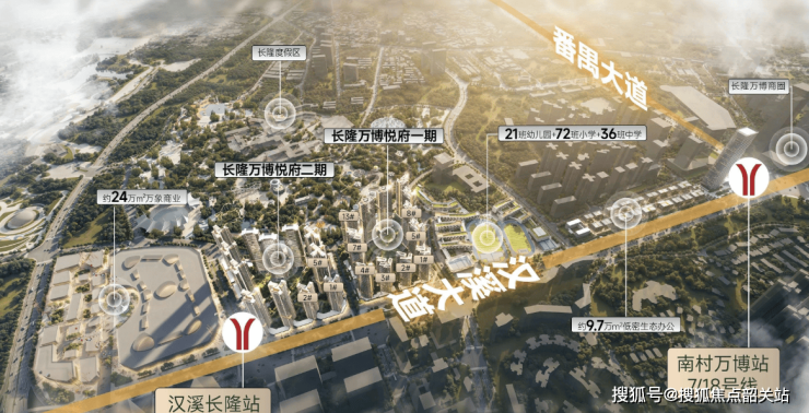 交通便利性:距离地铁3号线、7号线汉溪长隆站约500米,步行仅需8分钟;距离地铁18号线南村万博站约1.2公里。此外,项目周边还有多条重要交通线路,使得出行极为方便。