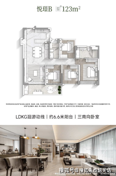 悦璟B户型(约123㎡):南向卧室,LDKG设计,配备约6.6米双面宽阳台,最大化景观视野。