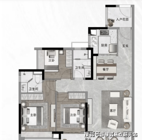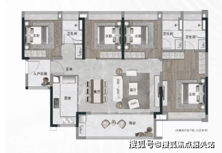 143㎡四房:豪华主套设计,横厅+外接大阳台,气派非凡。