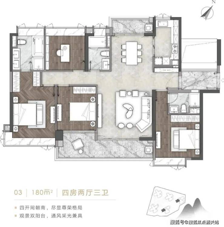180平方米四房两厅三卫:超大客厅设计,宽敞明亮,适合大家庭居住。