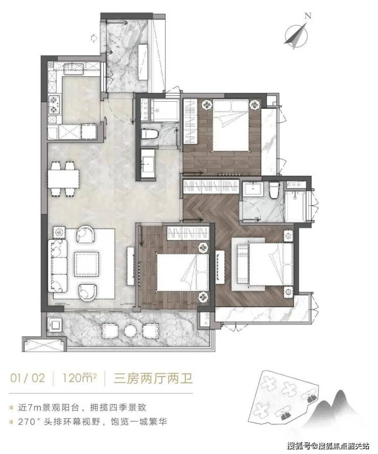 120平方米三房两厅两卫:动静分离,主卧套间设计,入户花园增添生活情趣。