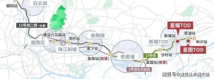 越秀星图TOD横跨13号线官湖站和新沙站,小区东西两个主入口分别距离两站仅450米和650米,步行时间在5到10分钟之间。13号线二期工程预计于2024年通车,届时可直达天河区,大大缩短通勤时间。
