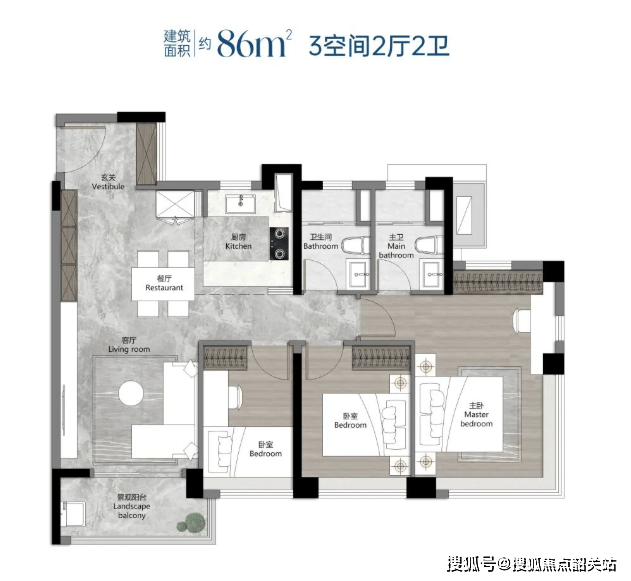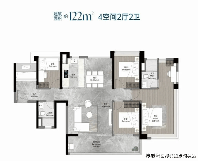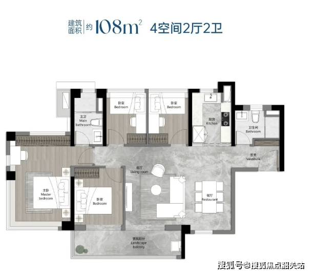 建面约108平方米:四房设计,横厅布局,阳台开间达5.95米,观景视野开阔。