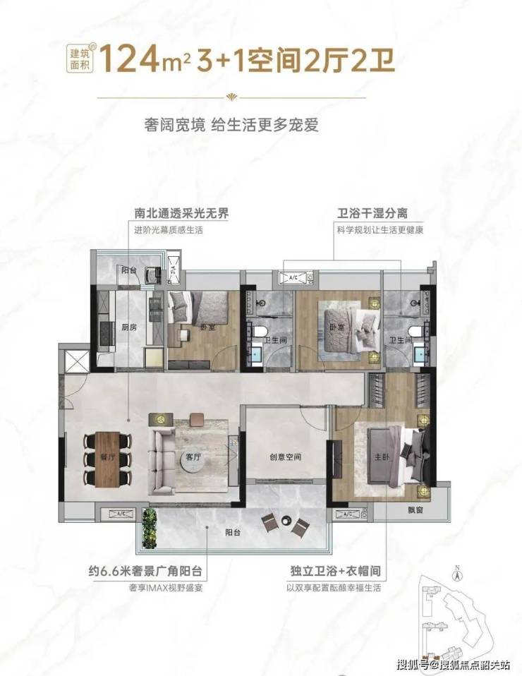 建面约124㎡3+1房,横厅设计,零过道浪费,特别适合二胎三胎家庭。