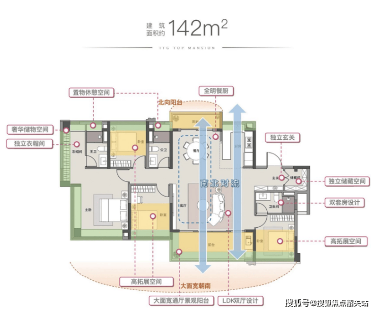 142平米四房三卫:南北双阳台,专梯入户,适合追求高品质生活的家庭。