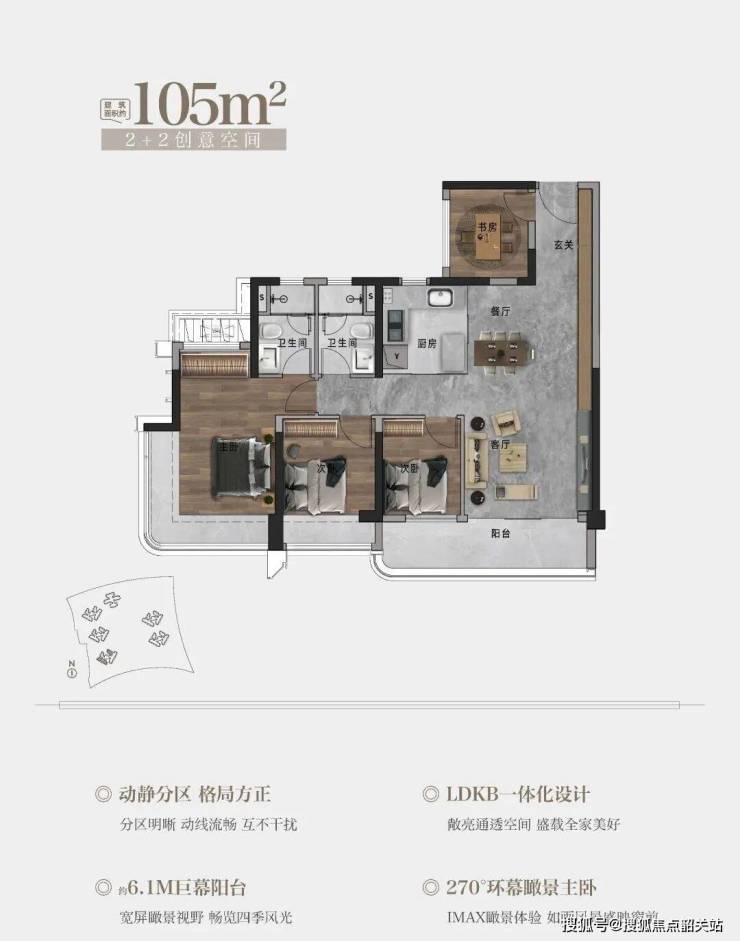 以88㎡户型为例,其特点在于约5.7M巨幕阳台及270°环幕瞰景主卧,LDKB一体化设计增加了空间的开放感和灵活性。所有户型不分大小,全都是3.05米层高,为居住者提供了更为宽敞舒适的居住环境。