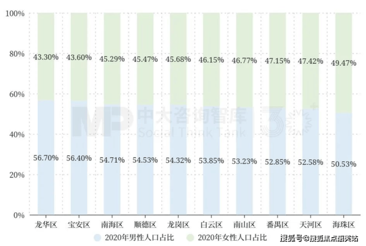就性别结构而言,2020年,前10强区县中,男性人口均多于女性人口,其中,深圳市龙华区、深圳市宝安区男女比例差值均超过10%;相比之下,广州市海珠区最接近性别比例均衡的状态,差值仅为2.12%(见图 2)。