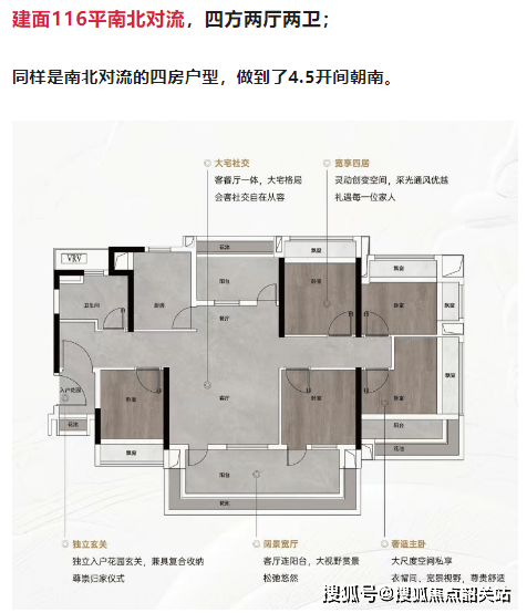 建面115平方米南北对流四方两厅两卫:四开间朝南,宽阳台设计,花池赠送增加空间阔绰感。