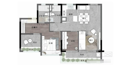 约78㎡ 2+1房2厅2卫:四开间采光,全明通透户型,客厅&次卧空间随心组合,约5.5米双面宽阳台,主卧独立套房,开间达3.8米。